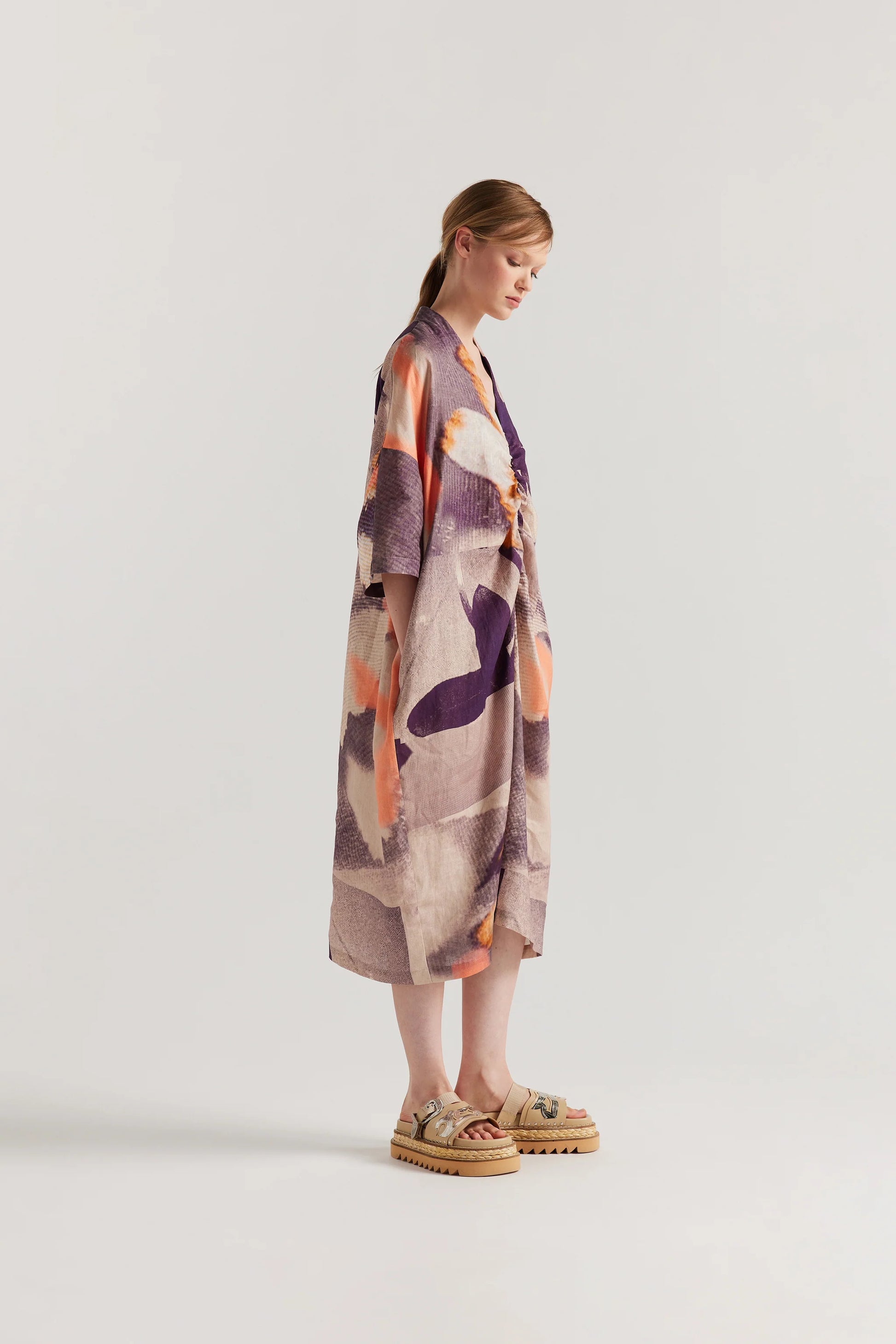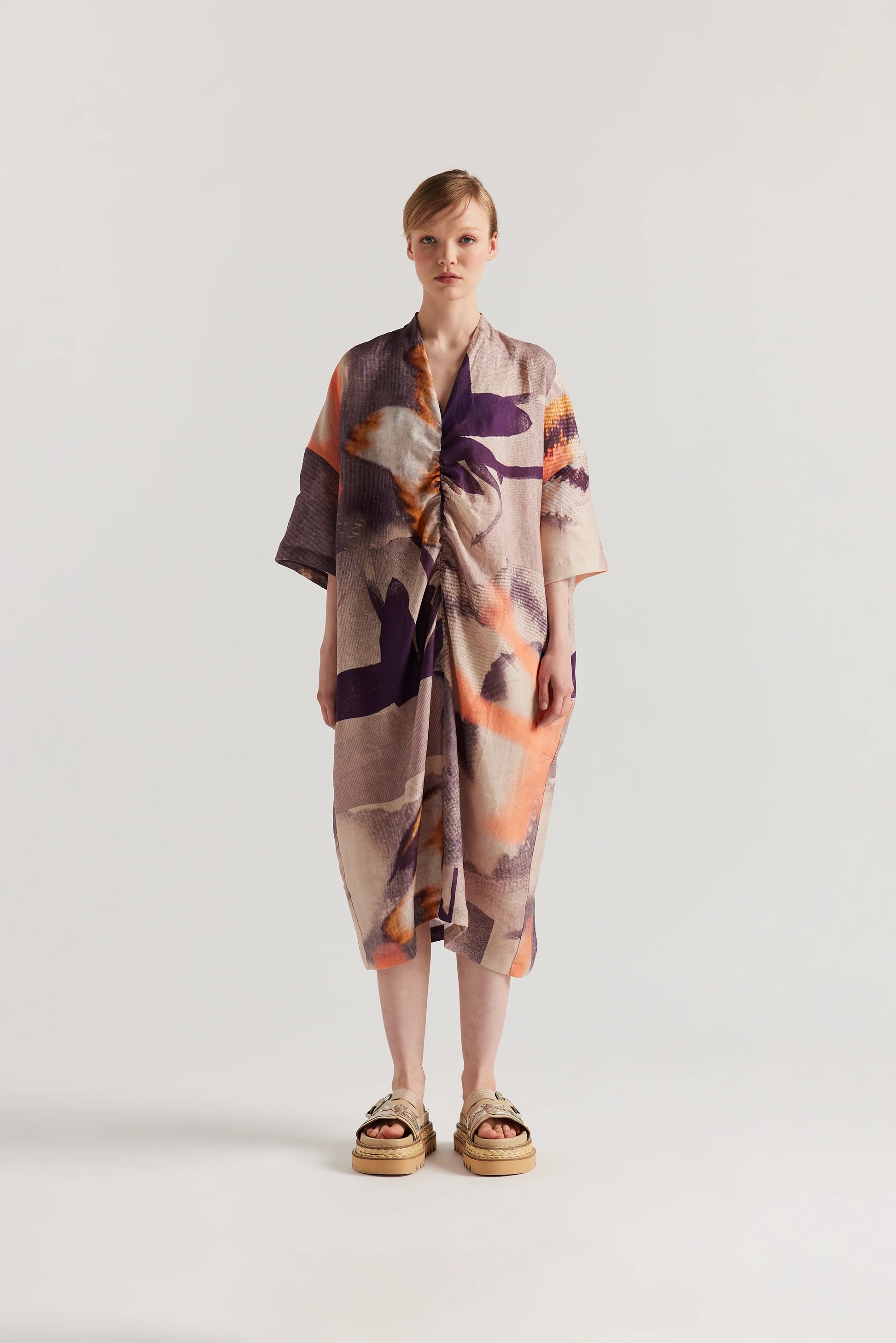 A relaxed V-neck dress cut in airy 100% linen, featuring soft gathers through the centre front for gentle drape and movement. Designed in this season’s Kloke Chaos print, it falls with an easy, oversized silhouette that feels effortless from day to night. A lightweight, fluid piece made to carry you through summer and beyond.