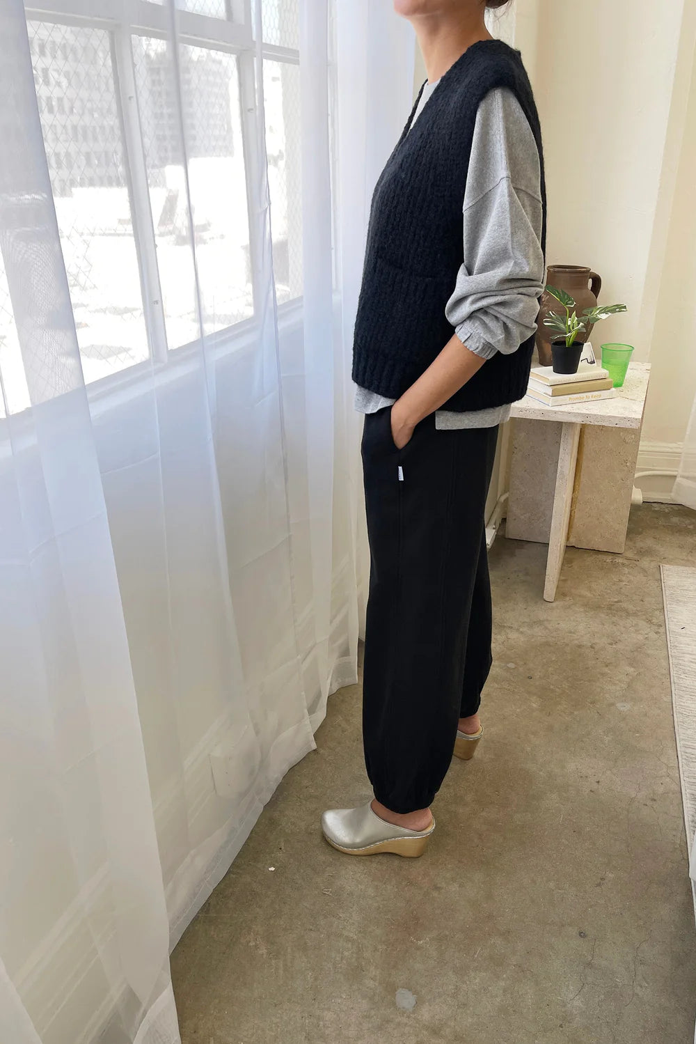 She also has thoughtful design details like an elastic leg opening that showcases any shoe, a comfortable elastic high waist, slimming side panels and hidden side slit pockets. The ideal knit pant yet comfier then your pajamas, she will be your new uniform at home, in the office, running around town and even the great outdoors.