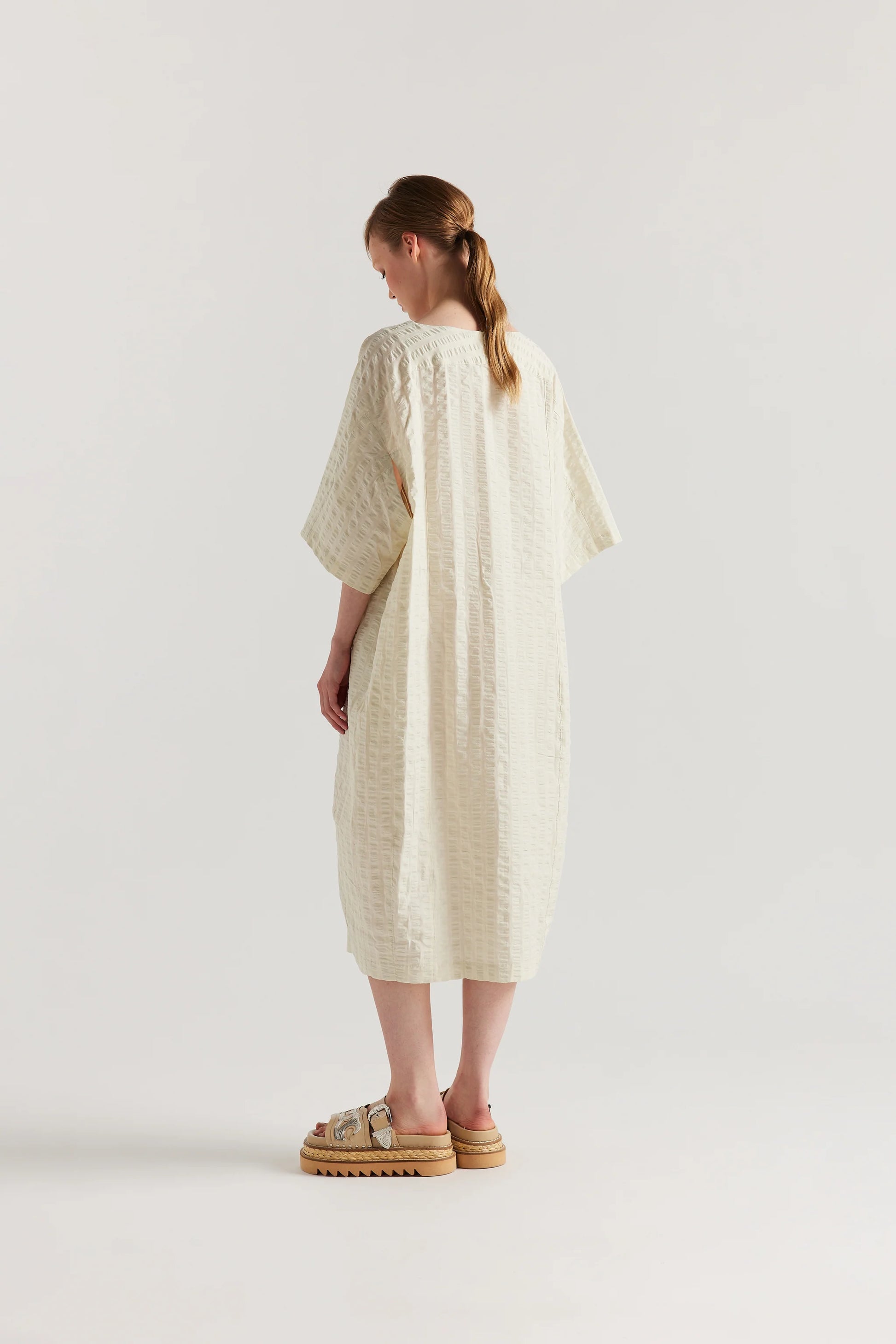 The Origin Dress offers an easy, relaxed silhouette, cut in our Kloke-designed yarn-dyed gingham seersucker. A considered balance of form and function, it features a subtle split underarm detail for movement and visual interest, in-seam side pockets, and an internal encased self-tie. The tie allows for versatile styling — wear it loose and free-flowing, or cinch and blouse the waist for shape. An adaptable piece designed to shift effortlessly through all occasions.
