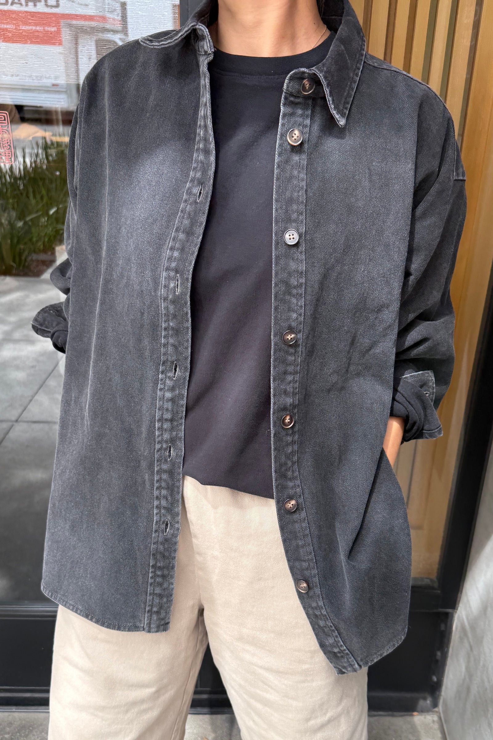 A timeless denim staple, perfect for layering or wearing on its own. Designed with the same relaxed fit as the Owen Shirt, but crafted in a slightly heavier, more durable denim fabric. Finished with an oversized silhouette, functional button front, contrast stitching, and a classic rounded hem.